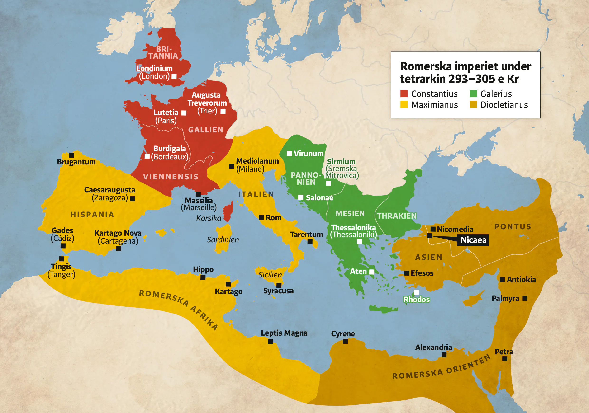 Den 1 maj år 305 e Kr inträffade något som tidigare aldrig hade hänt – romarrikets kejsare gick i frivillig pension. På en höjd utanför staden Nikomedia i nuvarande Turkiet hade kejsarens garde, arméns befälhavare och hovets ministrar samlats runt en talarplattform för att bevittna ceremonin. I själva verket handlade det inte om en utan två kejsare som avgick. Samtidigt som Diocletianus i den östra rikshalvan lade ned sina maktbefogenheter gjorde hans kollega Maximianus likadant borta i Milano.