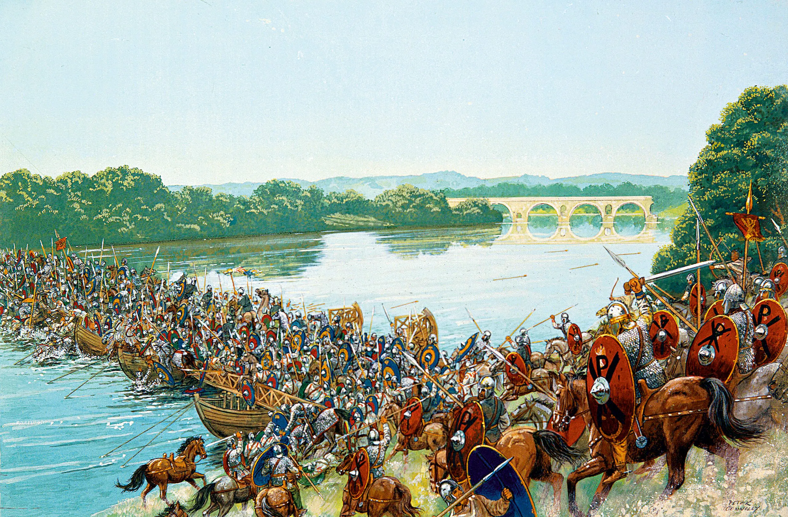 Den 28 oktober 312 stod det avgörande slaget vid bron Pons Mulvius utanför Rom, när Konstantin besegrade Italiens kejsare Maxentius. Dagen före slaget ska han enligt Eusebios ha sett ett flammande kors i skyn tillsammans med meddelandet "i detta tecken skall du segra". På natten kom Jesus till honom i en dröm och uppmanade honom att "ange Guds himmelska tecken på sköldarna". Genom att "anbringa bokstaven X på tvären och böja den översta spetsen till en rundel angav han Kristi namn", berättar Lactantius. Problemet är bara att varken Lactantius eller Eusebios var på plats när händelsen sägs ha ägt rum. Lactantius nämner heller inte Jesus, utan låter bara förstå att Konstantin fick en gudomlig uppmaning – att fältherrar mötte gudar i drömmen före ett slag förekom genom hela antiken.