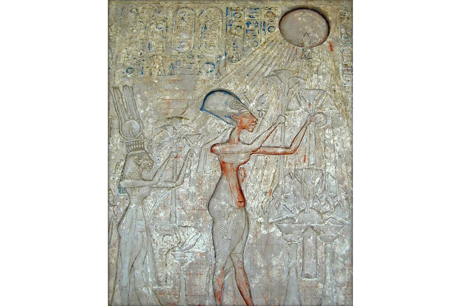 Men detta ändrade Echnaton på. Man vet att han under sin första tid på tronen hyllade de traditionella gudarna men att han senare blev monoteist – historiens förste – och förbjöd all dyrkan av andra gudar än den av honom utvalde: Aton, solskivan. Till och med pluralformen av ordet gud förbjöds och gamla gudabilder och namn förstördes systematiskt.