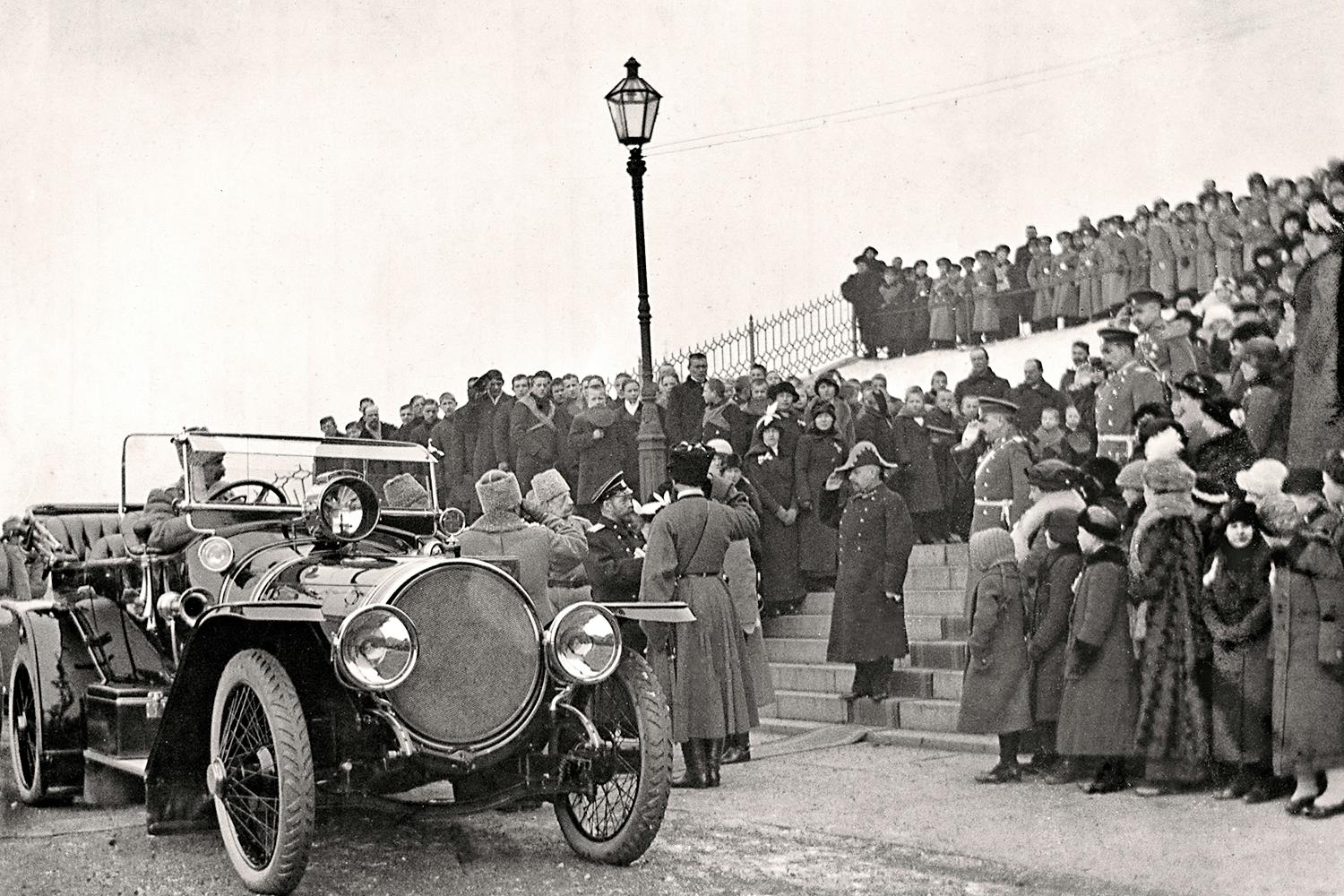 Rysslands siste tsar, Nikolaj II, på besök i Helsingfors 1915. Han står i mörka kläder till vänster nedanför lyktstolpen.