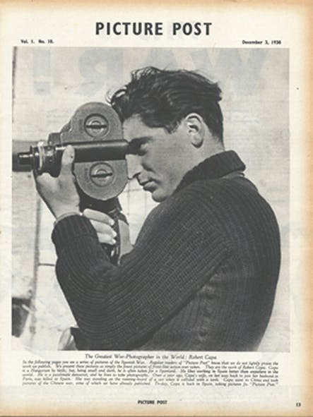 Den som iförd hjälm står på knä för att ta ett foto av de förbipasserande militärerna är Robert Capa (1913–54). Och den som befinner sig bakom honom, och fångar situationen med sin kamera, är den berömde krigsfotografens bildredaktör, som för en gångs skull är med vid fronten.