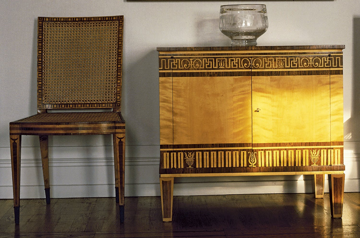 Traditionen och hantverket var viktiga för Carl Malmsten, en av 1900-talets mest berömda svenska möbelkonstnärer. Detta skåp från 1920-talet är dekorerat med inläggningar på 1700-talsvis.
