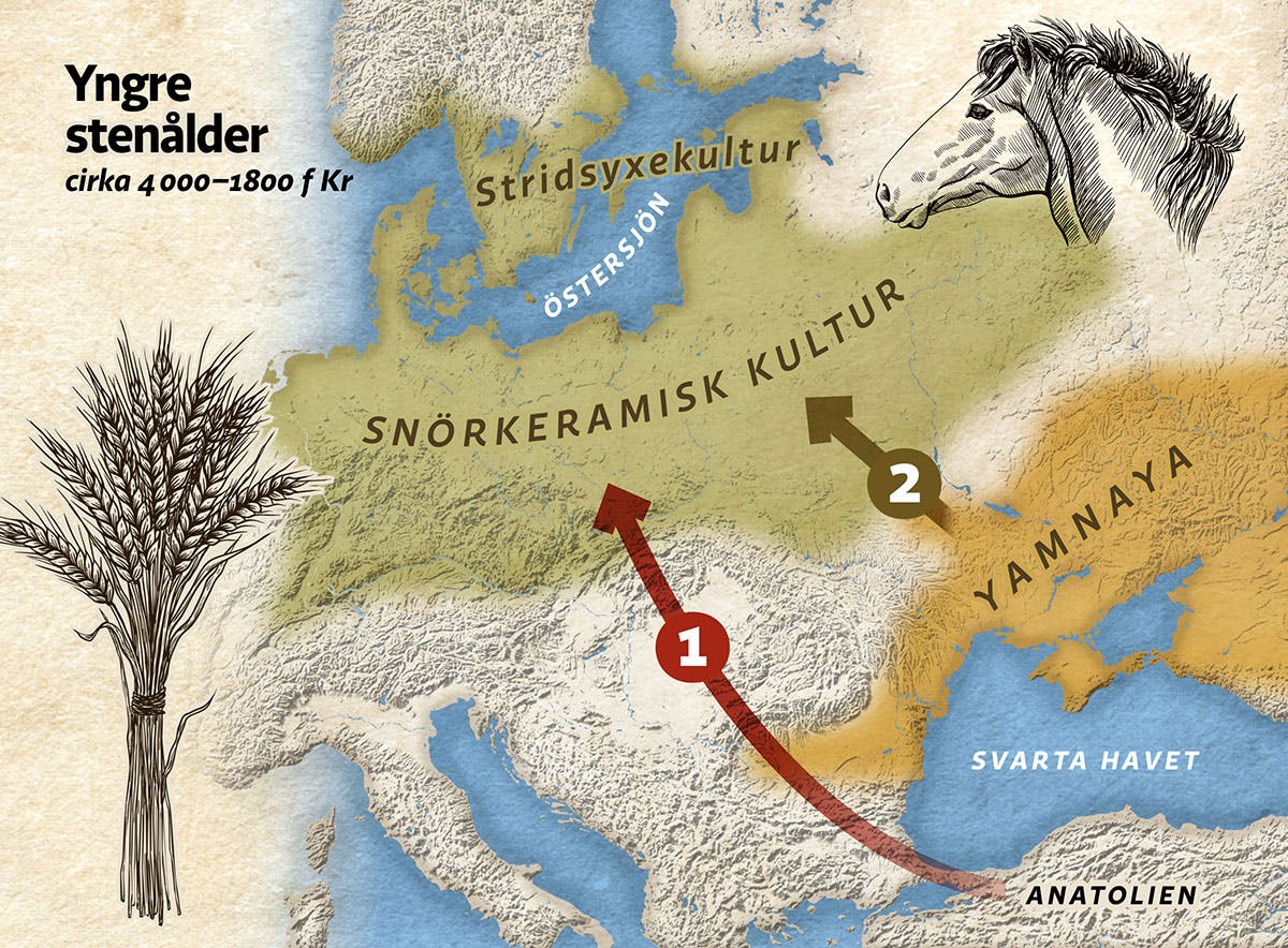 Till Mellansverige kom dessa stäppryttare österifrån, över Östersjön, omkring år 2800 f Kr. I vårt land kallas kulturen för stridsyxekultur (2800–2300 f Kr), uppkallad efter de ceremoniella yxor, som ofta påträffas i mansgravarna. På kontinenten talar man om snörkeramisk kultur (efter dekoren på deras keramikkärl). Genetiska studier av skelett från stridsyxekulturen visar att de härstammar från de indoeuropéer hörande till yamnayakulturen som utvandrade från den ukrainska stäppen.