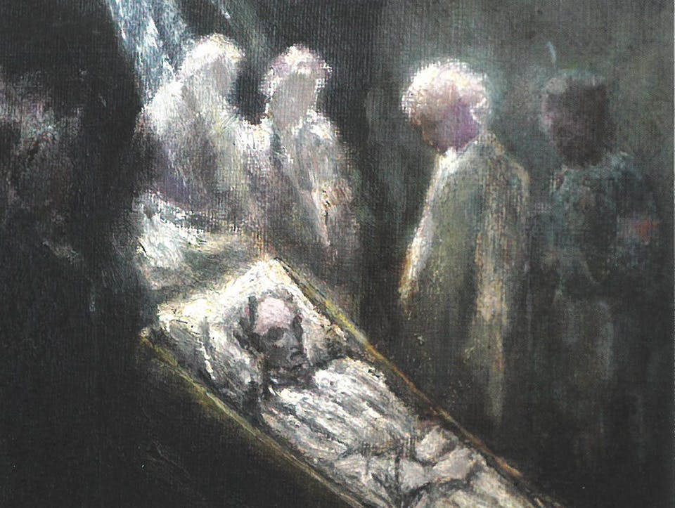 Nu borttogs kuddarna. Det var en bredaxlad krigare, som låg där i den långa veckrika skjortan, vilans och sömnens rätta dräkt. Konungsligare vilar ingen konung. Blott de handskbeklädda, hoptorkade händerna hade ett slappt läge, de händer som förr hållit så hårt om värjkavlen, och jag kan ej tänka annat, än att de från början varit korslagda och sedan glidit isär…