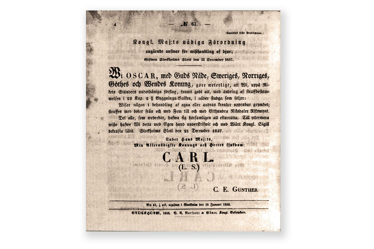Frågan var emellertid väckt och när den första lagen mot misshandel av lantbrukets djur slutligen antogs 1857 hade den föregåtts av flitigt debatterande. Bland annat hade utredare noterat att de flesta grannländer redan hade infogat djurskydd i lagen. Sverige var alltså inte en föregångare i detta avseende.