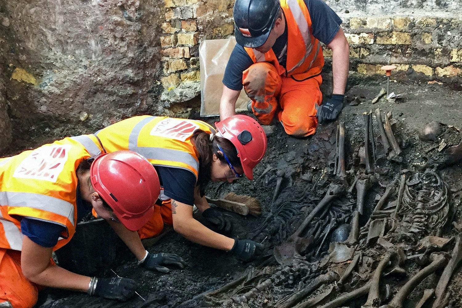 Det var i samband med ett järnvägsbygge i London som arkeologer från Museum of London Archaeology fick tillfälle att undersöka en gammal begravningsplats med över tretusen skelett. Bland dem låg 42 individer i en massgrav vilka misstänktes ha fallit offer för pesten 1665.